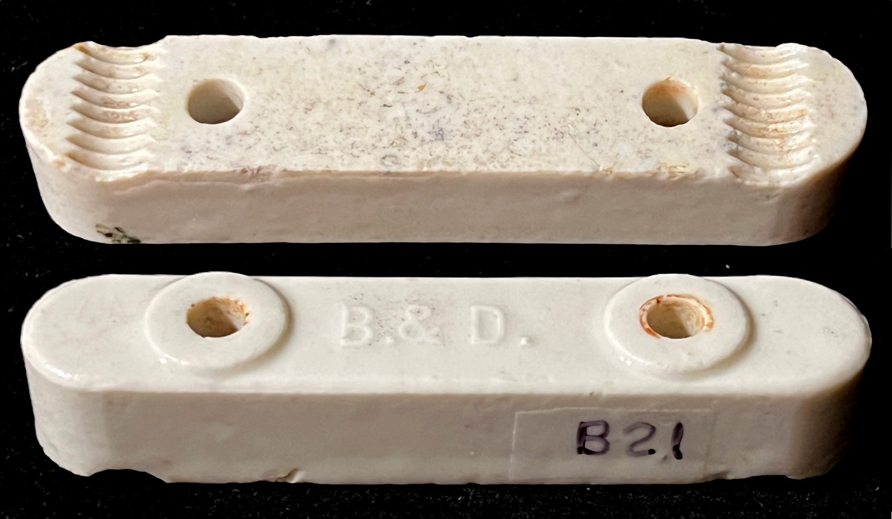 The first wiring cleat was patent No. 411,801 in 1889. No examples exist. The next patent was 422,651 in 1890. The ends were obviously fragile and not specimens exist. Patent 444,317 granted in 1891 is a one piece cleat -- no specimens exist. Patent 458,964 resembles the common two-part cleat, but a bit more complex. General Electric cleats are known with this patent date (g2, g3, g6, and g19). Finally, patent No. 476,827 granted to Pass & Seymour (Syracuse, NY) in 1892 represents the typical wiring cleat. That patent is represented in cleats p3 and p4. Both are very rare. The most famous and widely used were the B & D cleats based on patents 505,215 and 505,912 granted to Elisha Buffington in 1893 and 544,501 in 1895 with 50% rights assigned on all three patents to Albert Dow. The three patents were widely licensed to other companies to produce porcelain cleats. The most notable companies were Imperial Porcelain Works and General Electric. Patent 505,215 was particularly important in that it provided a spacer or gap across the bottom half of the cleat to allow for nailing against irregularly shaped (not flat) walls and rafters, which prevented the cleat from breaking when it was nailed in place. Patent 505,912 provided a different solution to this problem by projections in the bottom half outside the holes to keep the cleat away from an irregular surface. Other companies finally found a way around these B & D patents by adding circular bosses around the nail holes, which held the cleat away from the irregular surface.