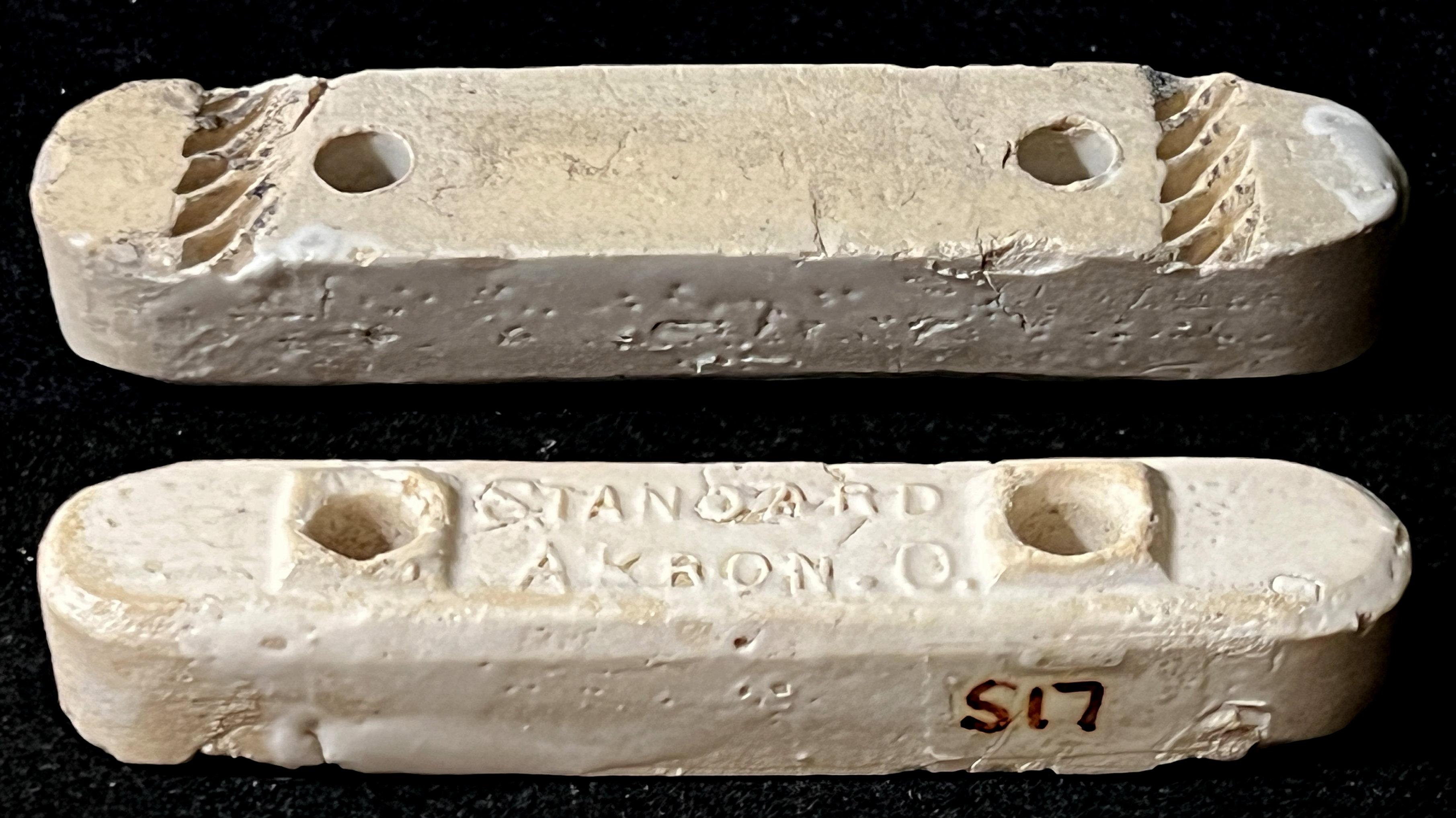 The first wiring cleat was patent No. 411,801 in 1889. No examples exist. The next patent was 422,651 in 1890. The ends were obviously fragile and not specimens exist. Patent 444,317 granted in 1891 is a one piece cleat -- no specimens exist. Patent 458,964 resembles the common two-part cleat, but a bit more complex. General Electric cleats are known with this patent date (g2, g3, g6, and g19). Finally, patent No. 476,827 granted to Pass & Seymour (Syracuse, NY) in 1892 represents the typical wiring cleat. That patent is represented in cleats p3 and p4. Both are very rare. The most famous and widely used were the B & D cleats based on patents 505,215 and 505,912 granted to Elisha Buffington in 1893 and 544,501 in 1895 with 50% rights assigned on all three patents to Albert Dow. The three patents were widely licensed to other companies to produce porcelain cleats. The most notable companies were Imperial Porcelain Works and General Electric. Patent 505,215 was particularly important in that it provided a spacer or gap across the bottom half of the cleat to allow for nailing against irregularly shaped (not flat) walls and rafters, which prevented the cleat from breaking when it was nailed in place. Patent 505,912 provided a different solution to this problem by projections in the bottom half outside the holes to keep the cleat away from an irregular surface. Other companies finally found a way around these B & D patents by adding circular bosses around the nail holes, which held the cleat away from the irregular surface.